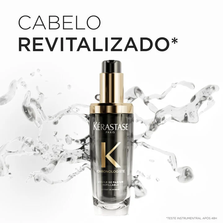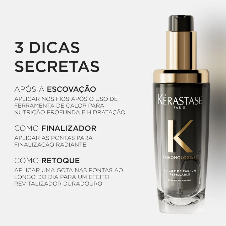 O Kit Kérastase Chronologiste com refil para todos os tipos de cabelo é infundido com extrato de Mirra, que visa nutrir os fios. Kérastase Chronologiste L’Huile de Parfum é um óleo capilar perfumado composto por uma combinação excepcional de notas nobres do mundo da alta perfumaria: Rosa Chá, Madeiras Claras e Almíscar. Delicadamente perfumados, os cabelos ficam revitalizados, hidratados e espessos após algumas gotas.