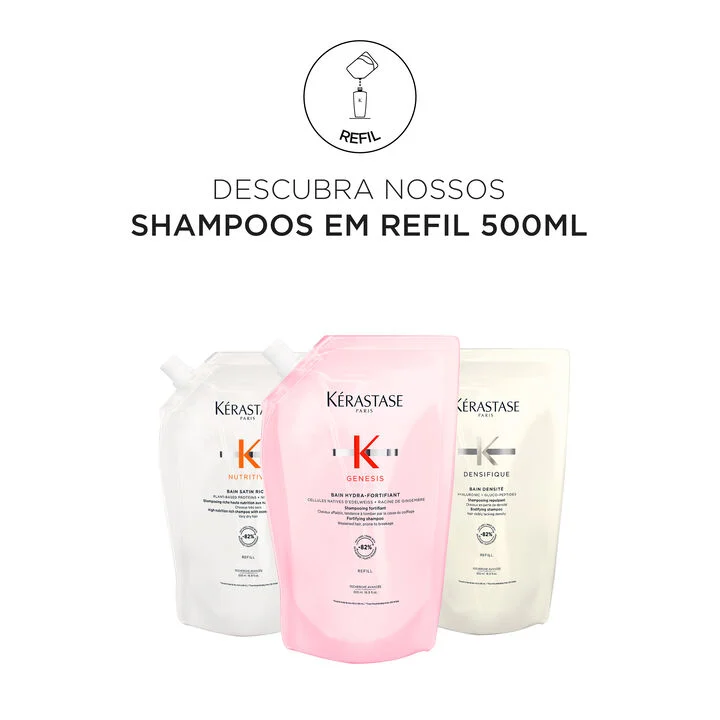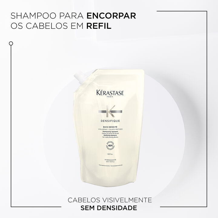 Para prolongar sua experiência com o shampoo para cabelos finos Bain Densité e promover um consumo consciente, agora você pode adquirir o refil de 500ml. Sua fórmula desenvolvida para fibras capilares com perda de densidade. O Shampoo Kérastase Bain Densité fortalece o cabelo na fibra e desperta os folículos adormecidos para dar mais textura, substância e resistência ao cabelo. A fibra e a elasticidade são restauradas para que o cabelo pareça visivelmente mais encorpado e com aparência mais espessa.
